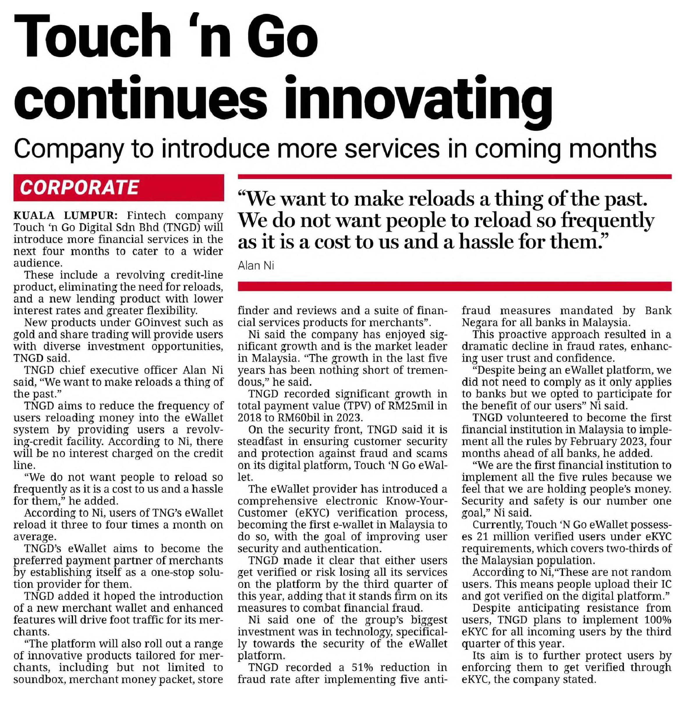 Looking ahead to 2024, TNG Digital remains committed to innovation and enhancing user experience. Ni outlined the company's strategic priorities for the coming year, where Touch 'n Go eWallet is set to introduce groundbreaking financial services products to cater to a broader audience. These include a revolving credit line product, eliminating the need for reloads, and a new lending product with lower interest rates and greater flexibility.