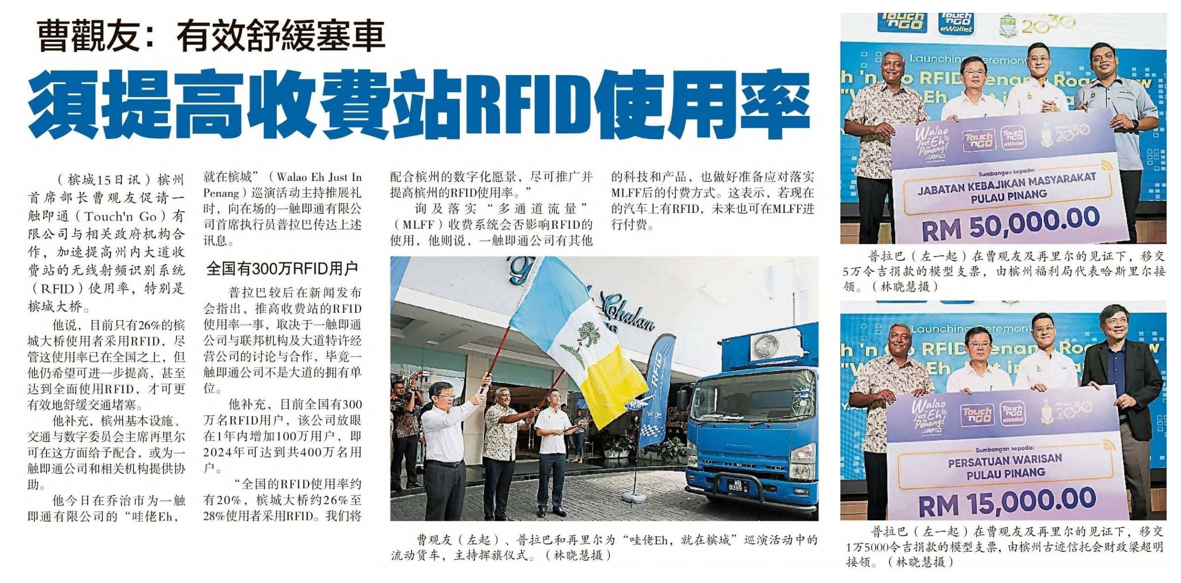 Commenting on Touch ‘n Go’s presence in Penang, YAB Chow Kon Yeow said, “The implementation of e-payment services, such as Touch ‘n Go RFID, is encouraged as it is convenient, efficient, and secure. With Touch ‘n Go embarking on this journey with us, we are confident of the ability to achieve the state’s mission to go 100 percent cashless by the year 2030. The state applauds Touch ‘n Go’s initiative and support, and we would like to take this opportunity to express gratitude for organizing this campaign to assist and equip Penangites with the right tools to go fully cashless.”