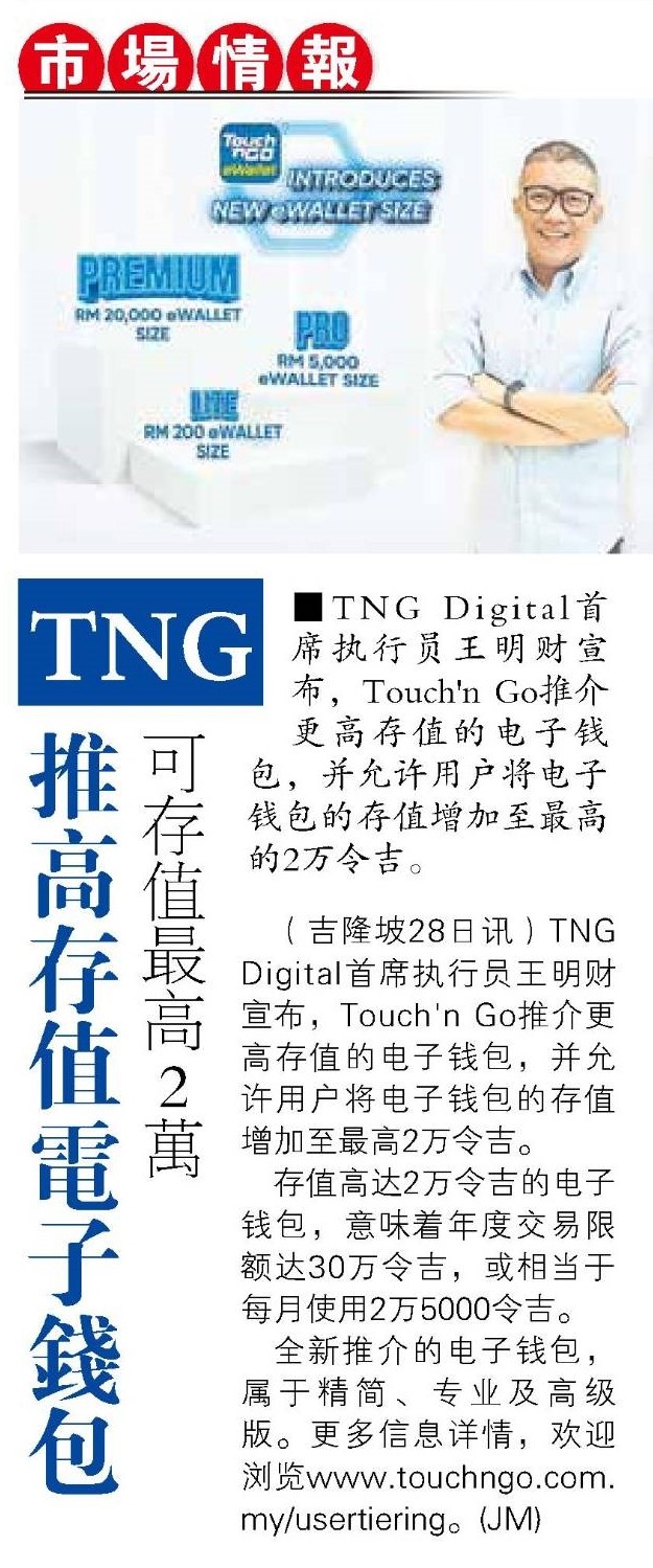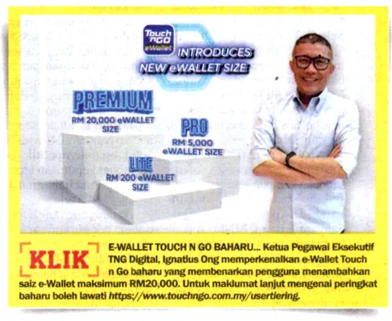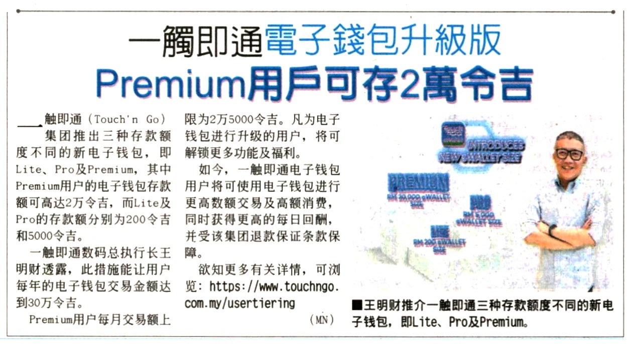 China Press (Bizbytes) - The upgraded version of Touch n Go e-wallet allows Premium users to deposit RM20,000