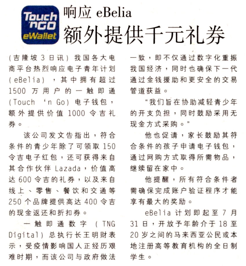 Nanyang Siang Pau - Touch 'n Go responds to eBelia with an additional RM1,000 gift voucher