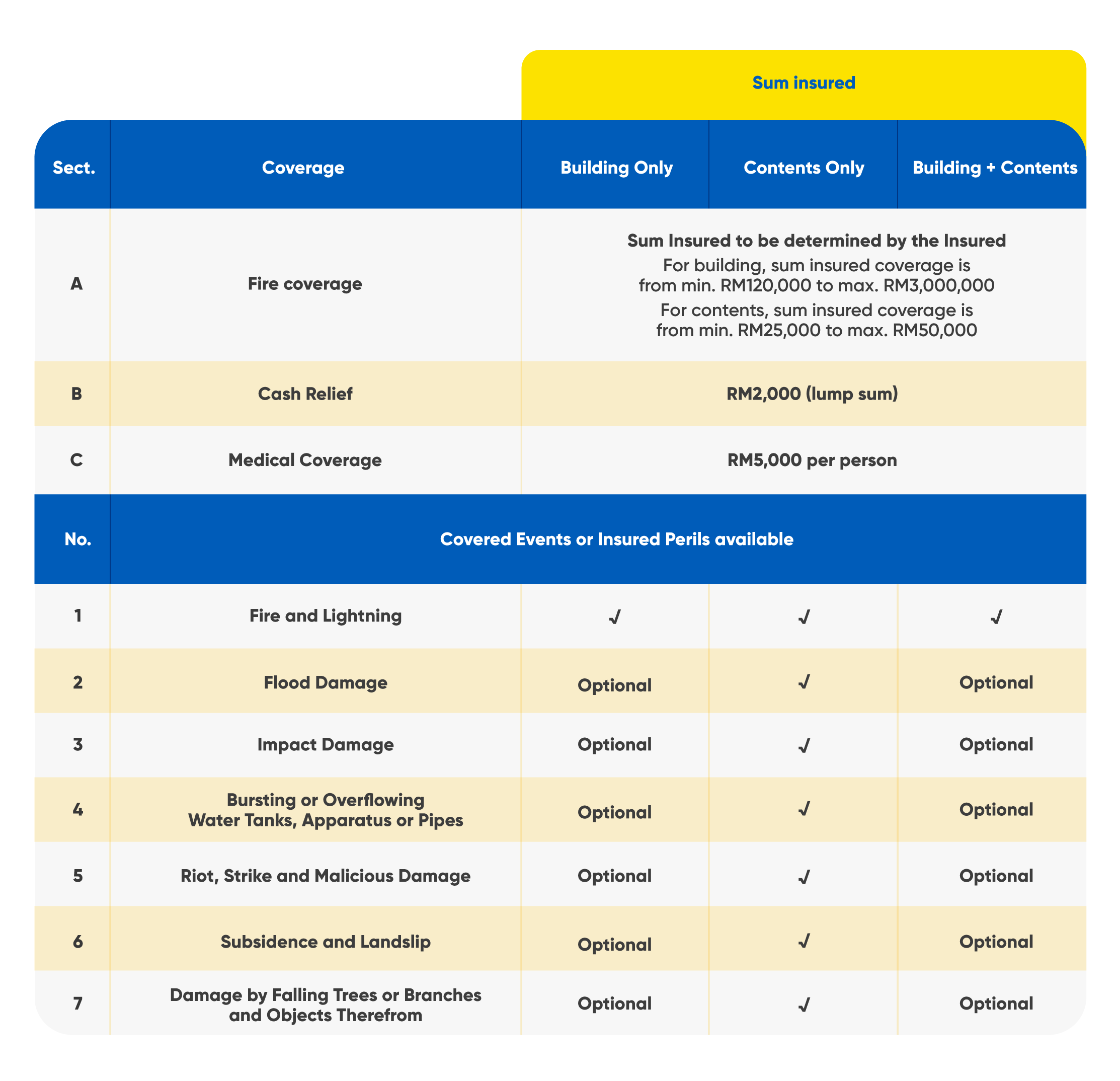 *Tariff Basic Fire insurance and Houseowner insurance are the different types of fire insurance coverage available for home. Tariff Basic Fire insurance covers your building and/or contents from loss or damage caused by fire and lightning. The coverage could also be extended to include flood, subsidence, landslip and other events. Tariff Houseowner insurance provides additional coverage compared to Tariff Basic Fire insurance to cover your building and it comes with a higher premium than Tariff Basic Fire insurance.