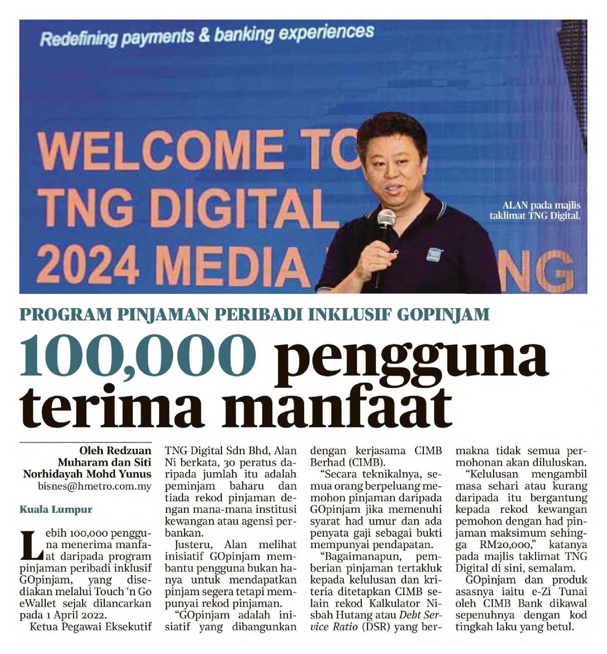 TNG Digital Sdn. Bhd. (“TNG Digital”), Malaysia's leading fintech player and operator of Touch 'n Go eWallet, held its first media briefing of the year today, reflecting on its market position and outlining its strategic outlook for 2024.