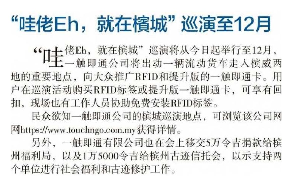 Visitors to the “Walao Eh Just In Penang” roadshow locations will enjoy various fun activities, as well as the chance to win exciting prizes such as Touch ‘n Go eWallet reload PINs, vouchers, and merchandise. Complimentary RFID tag fitment will also be available. For more information and the list of the roadshow locations, visit https://www.touchngo.com.my/promotion/penang-rfid-campaign-2023